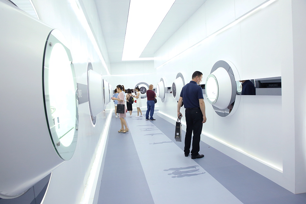 今年的雷諾表展館展臺(tái)以波浪形的表帶及表盤(pán)合成抽象的圓形表盤(pán),并配以燈光,極具視覺(jué)沖擊力,白色的線條猶如鋼琴的琴鍵,流暢而優(yōu)美,環(huán)繞展臺(tái)四周,時(shí)間與優(yōu)雅的生活完美融合,并在入口處設(shè)置時(shí)光隧道,光影穿梭,引領(lǐng)全新的商務(wù)體驗(yàn)和潮流。展館內(nèi)的流水幕墻,寓意著時(shí)光的流動(dòng)完美融合其中,展示效果更為生動(dòng)。