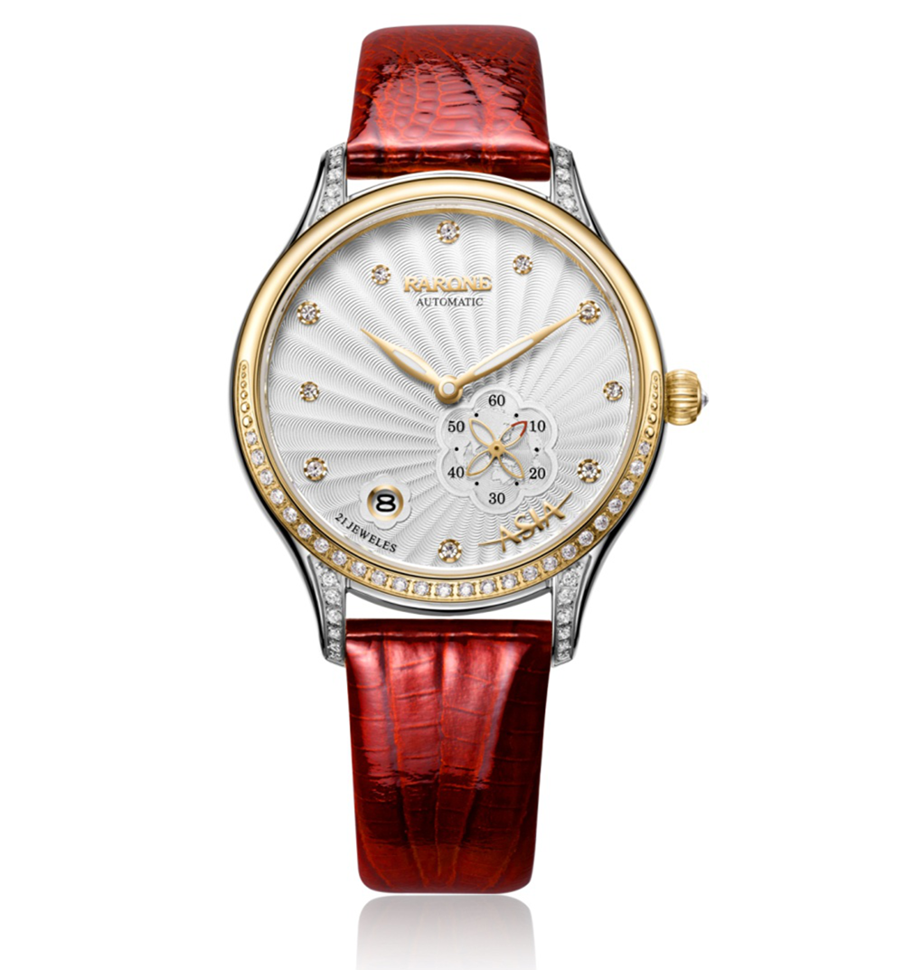 博鰲鼎智系列星月女表充分運用花瓣、星空、月牙等設計元素,結(jié)合商務腕表精簡要求,突出當代女性的優(yōu)雅和智慧特征,充滿唯美和時尚的風格氣息。60秒功能小眼,四葉花瓣形秒針,設計獨特,輕巧靈動;10顆水晶刻度猶如星空中點綴的繁星點點,大小不一,錯落有致,營造無限唯美的意境;表圈鑲嵌月牙形水晶石,更加閃耀璀璨。